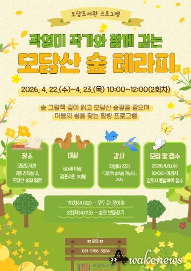 어웨이크뉴스 오경하 기자 | 김포시 모담도서관은 오는 4월 22일, 4월 23일 오전 10시부터 12시까지 모담도서관 2층 강의실과 모담산 숲길에서 힐링 프로그램 '곽영미 작가와 함께 걷는 모담산 숲 테라피'를 운영한다.