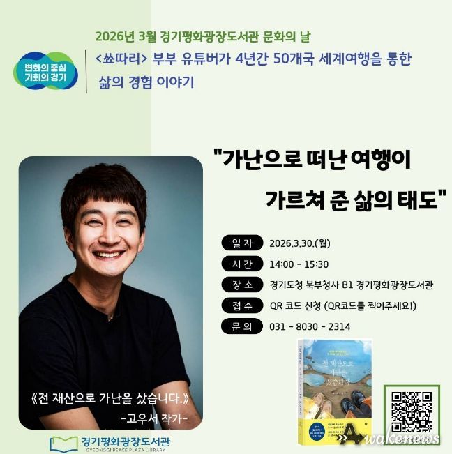어웨이크뉴스 오경하 기자 | 경기도는 30일 오후 2시 북부청사 경기평화광장도서관 원형 무대에서 ‘전 재산으로 가난을 샀습니다’의 저자 고우서 작가 초청 ‘2026년 3월 경기평화광장도서관 문화의 날’을 연다.