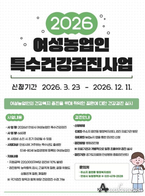 어웨이크뉴스 오경하 기자 | 안성시는 여성농업인의 농작업 관련 질환을 예방하고 건강한 영농 환경을 조성하기 위해 ‘2026년 여성농업인 특수건강검진 사업’을 오는 3월 23일부터 본격 추진한다고 밝혔다.