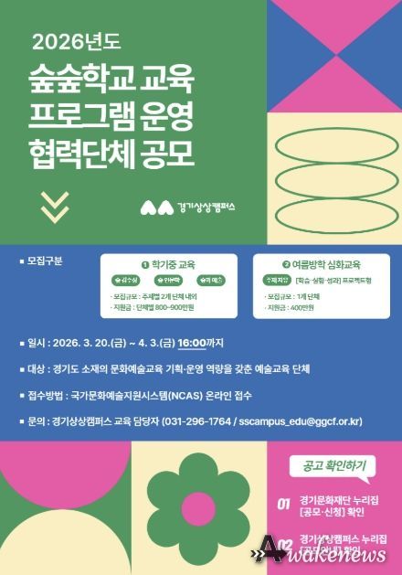 어웨이크뉴스 오경하 기자 | 경기문화재단 경기상상캠퍼스는 3월 20일부터 4월 3일 16시까지 2026 경기상상캠퍼스 ‘숲숲학교’ 교육 협력단체를 공개 모집한다.