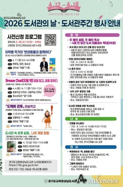 어웨이크뉴스 오경하 기자 | 경기도교육청성남도서관이 2026년 도서관의 날(4월 12일)과 도서관 주간(4월 12일~18일)을 맞아 다양한 독서·문화행사를 운영한다.
