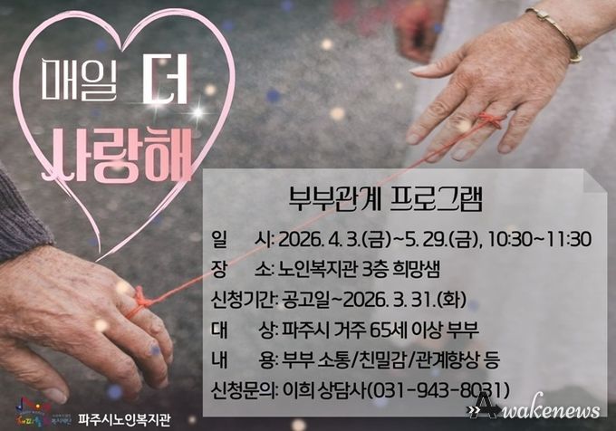 어웨이크뉴스 오경하 기자 | 파주시는 파주시노인복지관 노인상담센터가 파주시에 거주하는 65세 이상 부부를 대상으로 부부 관계 증진을 위한 ‘매일 더 사랑해’프로그램을 운영한다고 밝혔다.