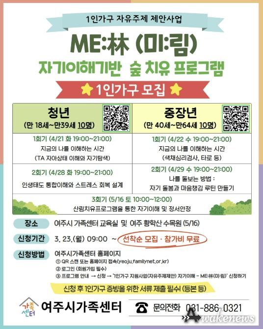 한편, 프로그램은 4월부터 총 3회기에 걸쳐 진행될 예정이며, 청년 1인 가구(만 18세~39세)와 중장년 1인 가구(만 40세~64세)를 대상으로 선착순 모집한다. 신청은 여주시가족센터 홈페이지를 통해 가능하다.