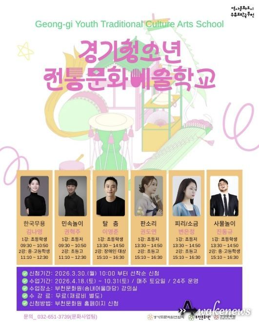 어웨이크뉴스 오경하 기자 | 부천문화원은 청소년들의 전통문화 참여 기회를 확대하고 경기지역 전통민속예술의 지속 가능한 전승 기반 마련을 위한 ‘2026 경기청소년전통문화예술학교’ 참여 학생을 모집한다.