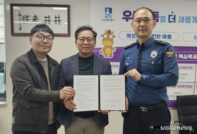 어웨이크뉴스 오경하 기자 | 수원시 팔달구 우만1동은 2026년 3월 27일, 주민 생활안전 강화를 위한 ‘어두운 골목 태양광 센서등 설치사업’의 원활한 추진을 위해 우만1동 행정복지센터·우만1동 주민자치회·팔달경찰서 간 서면 업무협약을 체결했다.