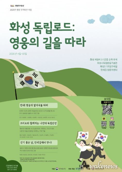 어웨이크뉴스 오경하 기자 | 화성특례시가 오는 4월부터 10월까지 화성 제암리 3·1운동 순국 유적지와 화성 3·1운동 만세길 일대에서 ‘2026 우리고장 국가유산 활용사업(생생문화재)’ 체험 프로그램 3개를 운영한다고 밝혔다. 생생문화재는 지역 문화유산을 이용해 문화적 가치를 새롭게 해석하고, 시민들이 이를 직접 향유할 수 있도록 구성한 체험형 프로그램이다.
