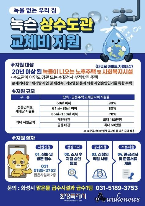 어웨이크뉴스 오경하 기자 | 화성특례시는 쾌적한 주거환경 조성과 안전한 식수 환경 개선을 위해 ‘2026년 녹물 없는 우리집 수도관 개량 지원사업’을 추진한다.