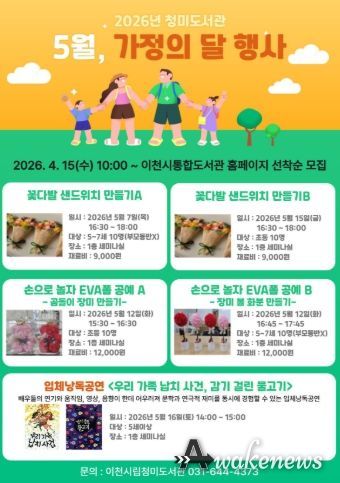 어웨이크뉴스 오경하 기자 | 이천시 청미도서관은 5월 가정의 달을 맞아 오는 5월 7일부터 5월 16일까지 어린이들을 위한 체험 프로그램과 가족들을 위한 입체낭독공연을 운영한다.