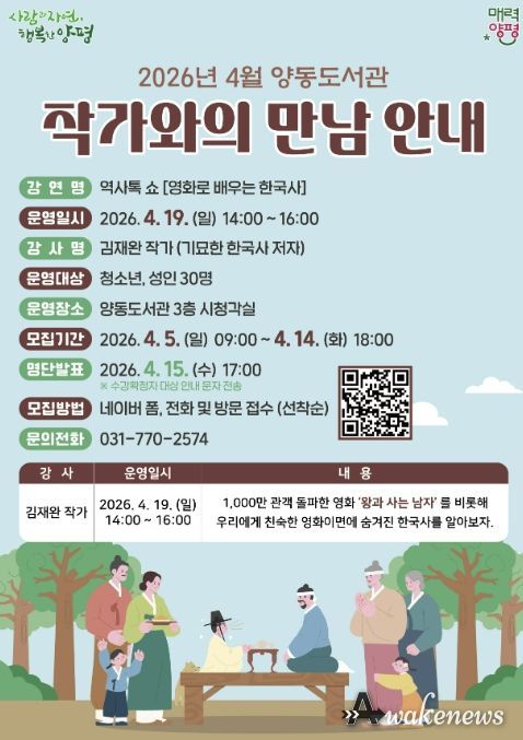 어웨이크뉴스 오경하 기자 | 양평군은 4월 도서관 주간을 맞아 양동도서관에서 ‘작가와의 만남’ 프로그램 참여자를 4월 5일부터 14일까지 모집한다고 밝혔다.