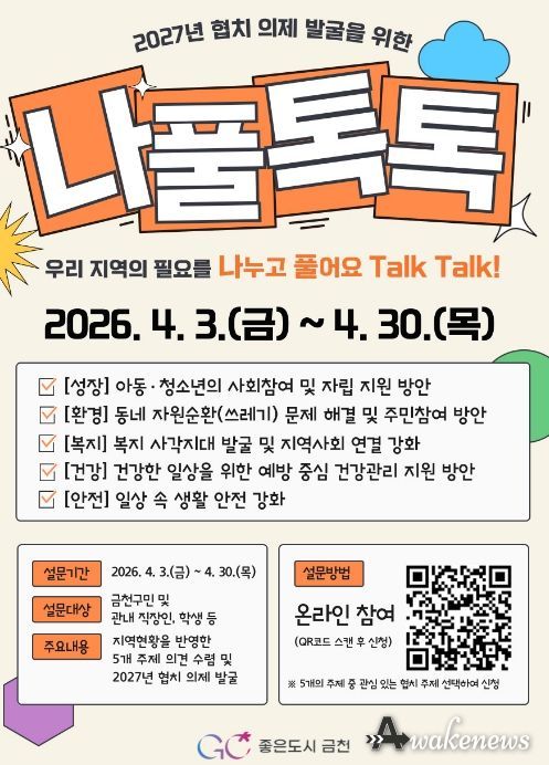 어웨이크뉴스 오경하 기자 | 금천구는 4월 3일부터 30일까지 온라인 플랫폼을 통해 주민 참여형 공론장인 ‘나풀톡톡(나누고 풀어요 Talk Talk)’을 운영한다고 밝혔다.