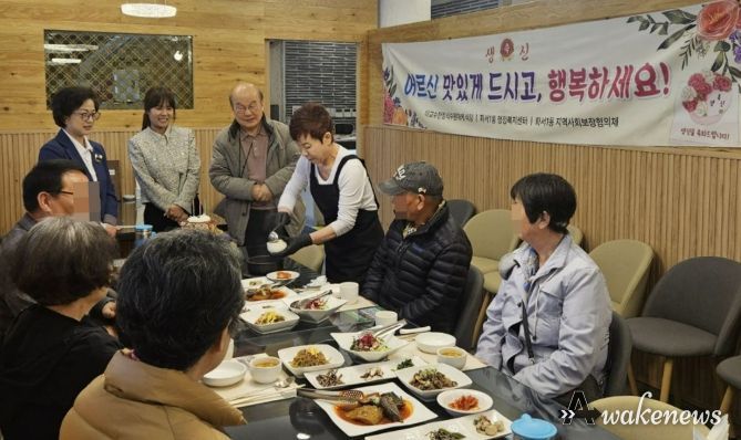 어웨이크뉴스 오경하 기자 | 수원시 팔달구 화서1동은 지난 1일, 4월 생일을 맞이한 독거어르신 7명을 모시고 이교수한정식에서 '어르신 사랑의 생신상' 행사를 진행했다.