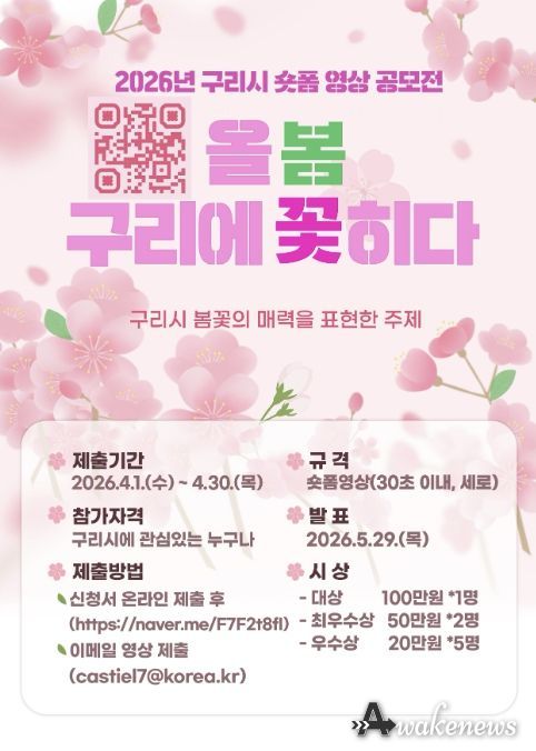 어웨이크뉴스 오경하 기자 | 구리시는 올해 새롭게 시작하는 봄꽃 축제 ‘장자호수 벚꽃마실 축제’를 효과적으로 홍보하고 시민과의 소통을 강화하기 위해 ‘2026 구리시 숏폼 영상 공모전 '올봄, 구리에 꽃히다'’ 접수를 4월 30일까지 진행한다고 밝혔다.