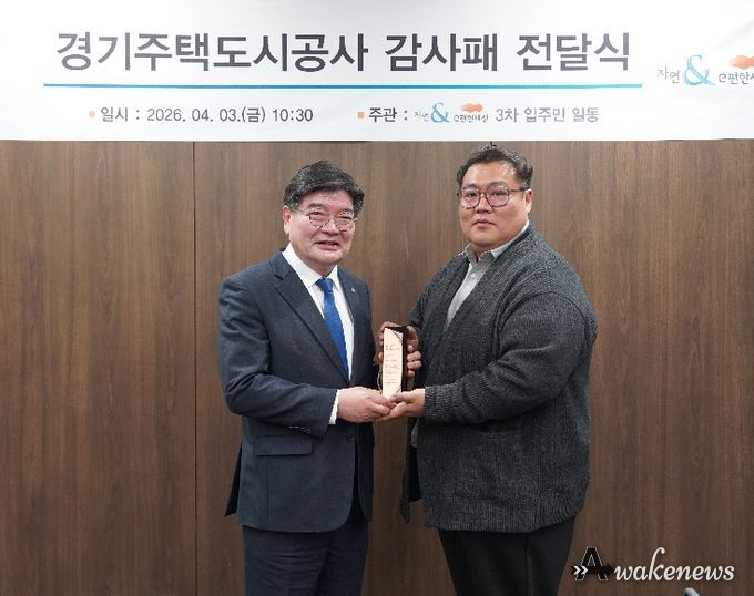 어웨이크뉴스 오경하 기자 | 경기주택도시공사(GH)가 수원 본사에서 다산자연앤이편한세상3차 아파트 입주민들로부터 원활한 조기 분양전환 노력과 제도적 지원에 따른 공로를 인정받아 감사패를 받았다고 3일 밝혔다.
