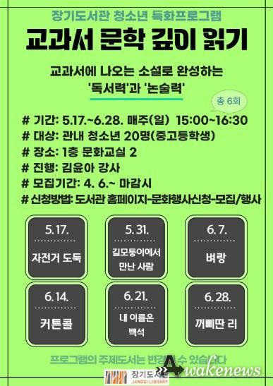 어웨이크뉴스 오경하 기자 | 김포시 장기도서관은 청소년의 독서력과 논술력 향상을 위해 '교과서 문학 깊이 읽기' 프로그램을 오는 5월 17일부터 6월 28일까지 진행한다.