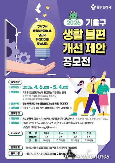 어웨이크뉴스 오경하 기자 | 용인특례시 기흥구는 오는 6일부터 5월 4일까지 ‘2026 기흥구 생활불편개선 제안 공모전’을 개최한다.