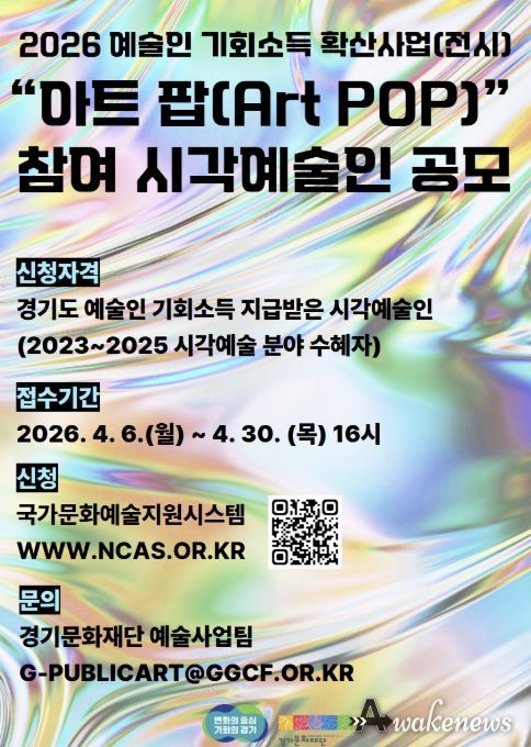 어웨이크뉴스 오경하 기자 | 경기도와 경기문화재단이 “2026 예술인 기회소득 확산사업(전시)“의 일환으로 진행하는 “아트 팝(Art POP)” 참여 시각예술인을 공개 모집한다.