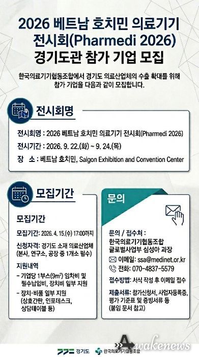 어웨이크뉴스 오경하 기자 | 경기도가 도내 의료산업체 해외 진출 지원을 위해 ‘2026년 베트남 호치민 의료기기 전시회(Pharmedi 2026)’에 참여할 기업을 오는 15일까지 모집한다.