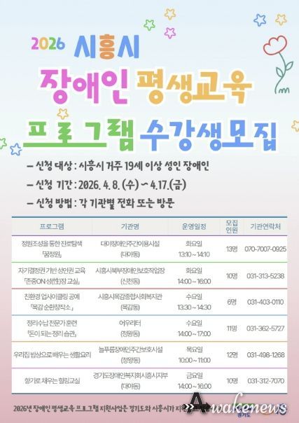 어웨이크뉴스 오경하 기자 | 시흥시가 관내 성인 장애인의 학습권 보장과 사회참여 확대를 위해 ‘2026년 장애인 평생교육 프로그램 지원사업’을 본격적으로 시작하며, 4월 8일부터 17일까지 프로그램 운영을 위한 학습자를 모집한다.