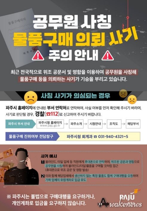 어웨이크뉴스 오경하 기자 | 파주시는 최근 전국적으로 확산 중인 공무원 사칭 사기 전화(보이스 피싱) 및 공문서 위조를 동반한 물품구매 사기 시도가 지속적으로 발생함에 따라, 관내 납품업체와 시민 피해 예방을 위해 각별한 주의를 당부했다.