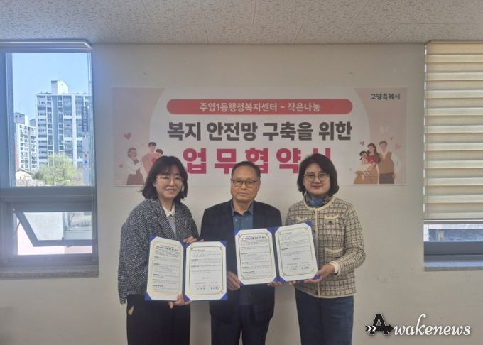 어웨이크뉴스 오경하 기자 | 고양특례시 주엽1동은 지난 7일 비영리단체 ‘작은나눔’과 지역사회 복지 사각지대 해소 및 소외계층 보호 강화를 위한 업무 협약을 체결했다.