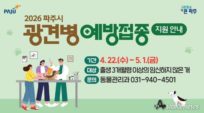 어웨이크뉴스 오경하 기자 | 파주시는 반려견을 동반한 야외 활동이 잦아지는 봄을 맞아 오는 4월 22일부터 5월 1일까지 생후 3개월 이상의 임신하지 않은 개를 대상으로 광견병 예방접종을 실시한다.