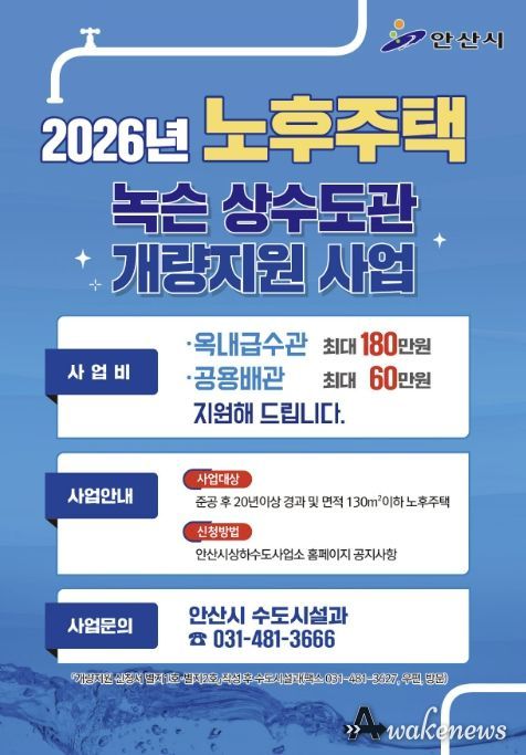 어웨이크뉴스 오경하 기자 | 안산시는 노후주택 상수도관에서 발생할 수 있는 녹물을 예방하고 안전하고 깨끗한 수돗물을 공급하기 위해 ‘녹물 없는 우리 집 수도관 개량 지원사업’을 추진한다고 9일 밝혔다.