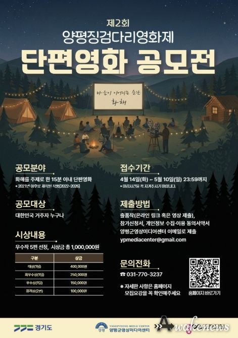 어웨이크뉴스 오경하 기자 | 양평군은 오는 4월 14일부터 5월 10일까지 ‘2026년 제2회 양평징검다리영화제 단편영화 공모전’을 개최한다고 밝혔다.