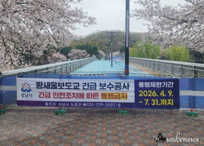 어웨이크뉴스 오경하 기자 | 성남시는 수내동 소재 탄천을 횡단하는 ‘황새울보도교’에서 구조적 결함인 슬래브 균열이 발견됨에 따라, 시민 안전을 확보하기 위해 4월 9일부터 교량 통행을 전면 금지한다고 밝혔다.