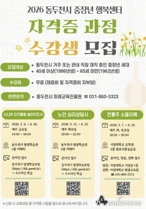 어웨이크뉴스 오경하 기자 | 동두천시 미래교육진흥원은 지역 내 중장년층의 성공적인 인생 2막과 안정적인 사회 참여를 지원하기 위해 ‘2026년 중장년 행복센터 자격증 과정’ 수강생을 모집한다고 밝혔다.