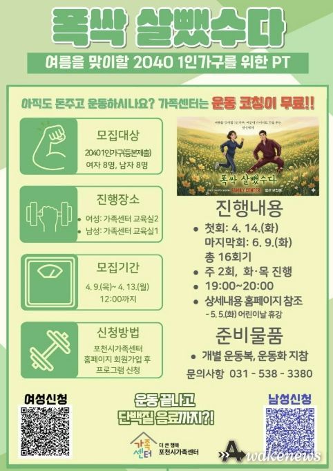 어웨이크뉴스 오경하 기자 | 포천시 더 큰 행복 포천시가족센터는 2040 청년 1인가구의 건강한 생활 습관 형성과 신체적·정신적 건강 증진을 돕기 위해 성별 맞춤 운동 프로그램 ‘폭싹 살뺐수다’ 참여자를 모집한다.