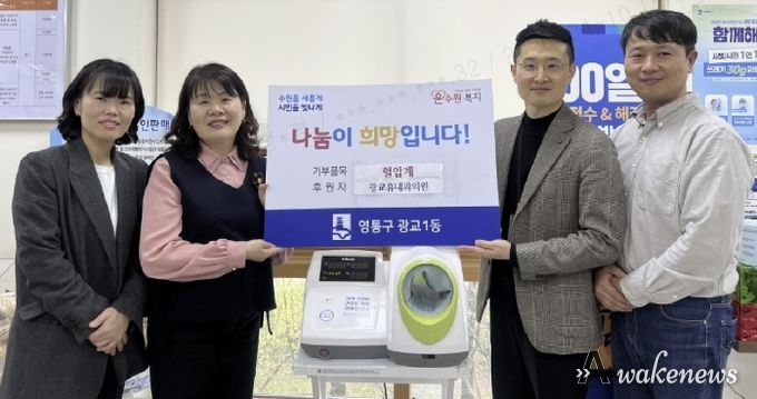 어웨이크뉴스 오경하 기자 | 수원시 영통구 광교1동은 지난 10일 광교휴내과의원으로부터 혈압계 1대를 기부받아 행정복지센터에 비치했다고 밝혔다.