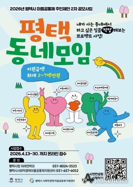 어웨이크뉴스 오경하 기자 | 평택시는 주민들이 스스로 만들어가는 만남과 소통의 마을 공간에서 지속 가능한 공동체 활동을 지원하고자, 지난 13일부터 녪년 평택시 마을공동체 주민제안 2차 공모사업’을 추진한다고 밝혔다.