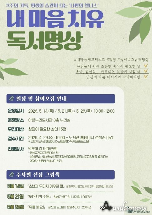 어웨이크뉴스 오경하 기자 | 고양특례시 아람누리도서관은 오는 5월 시민들의 정신건강 증진과 내면 탐구를 위한 독서문화 프로그램 ‘내 마음 치유, 독서명상’을 운영하며, 참여자를 이달 29일부터 모집한다.