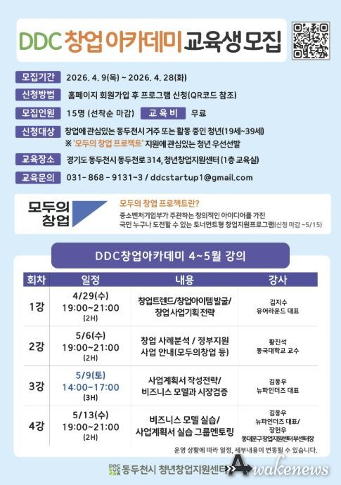 모집 대상은 동두천시에 거주하거나 활동 중인 19세부터 39세까지의 청년으로, 창업에 관심 있는 누구나 신청할 수 있다. 모집 인원은 15명 내외이며, 참가비는 무료다.