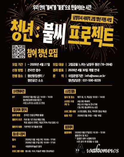 어웨이크뉴스 오경하 기자 | 남양주시는 13일 사회적 고립 청년의 일상 회복과 관계 형성을 지원하는 ‘청년:불씨 프로젝트’ 참여자를 오는 27일까지 모집한다고 밝혔다.