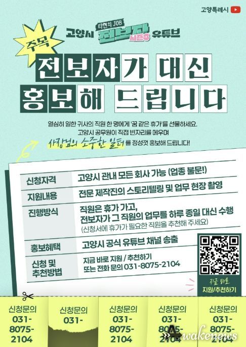 어웨이크뉴스 오경하 기자 | 고양특례시가 공식 유튜브 채널의 직업 체험 콘텐츠 ‘전보자(타인의 Job)’ 시즌 3를 맞아, 시민 삶의 현장으로 직접 찾아가는 홍보 프로젝트에 참여할 기업과 일터를 모집한다고 14일 밝혔다.