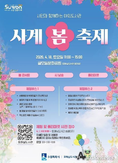어웨이크뉴스 오경하 기자 | 수원시 호매실도서관은 18일 글모둠문화공원(호매실도서관 옆 마당)에서 봄 콘서트와 시 낭송, 체험부스와 플리마켓 등으로 구성한 ‘사계-봄 축제’를 연다.