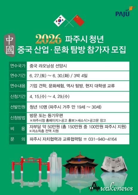 어웨이크뉴스 오경하 기자 | 파주시는 관내 청년들의 국제 산업 환경에 대한 이해를 높이고 국제 역량을 강화하기 위해 녪파주시 청년 중국 산업·문화 탐방’프로그램 참가자를 모집한다.