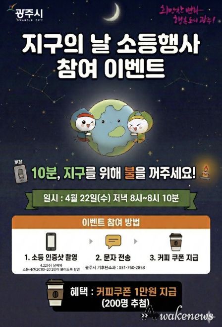 어웨이크뉴스 오경하 기자 | 광주시는 제56주년 지구의 날(4월 22일)을 기념해 당일 10분간 진행하는 소등 행사와 연계한 시민참여 온라인 행사를 추진한다고 14일 밝혔다.