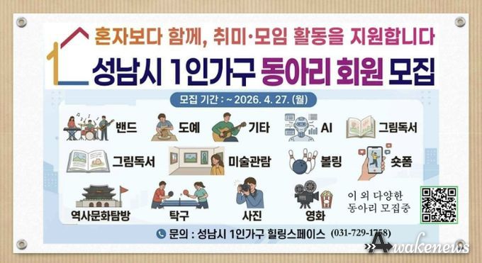 어웨이크뉴스 오경하 기자 | 성남시는 같은 취미를 가진 1인 가구들로 구성된 동아리에 연간 최대 70만원의 활동비를 지원한다고 15일 밝혔다.