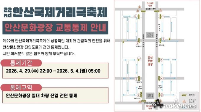 어웨이크뉴스 오경하 기자 | 안산시는 제22회 안산국제거리극축제 개최에 따라 4월 29일 오후 10시부터 5월 4일 오전 5시까지 안산문화광장 진입도로를 전면 통제한다고 15일 밝혔다.