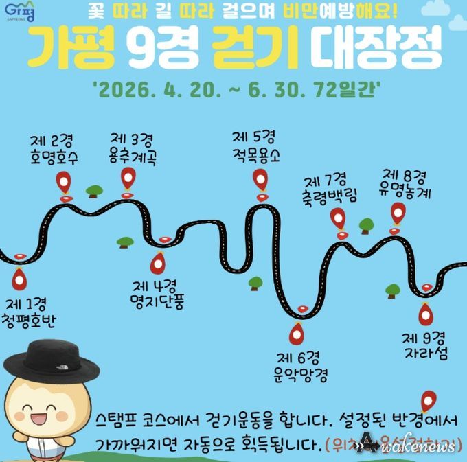 어웨이크뉴스 오경하 기자 | 가평군의 수려한 자연경관을 배경으로 건강을 다지는 ‘2026 가평 9경 걷기 대장정’이 오는 20일부터 시작된다. 가평군보건소는 군민들의 비만을 예방하고 걷기 실천율을 높이기 위해 이번 프로그램을 마련했다고 15일 밝혔다.