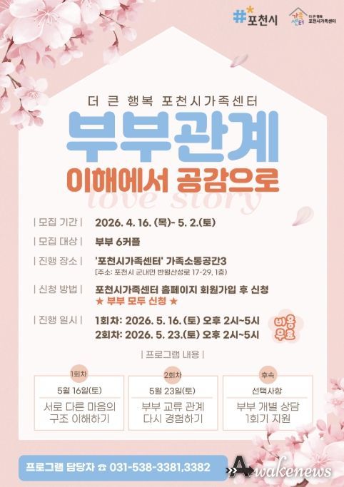 어웨이크뉴스 오경하 기자 | 포천시 직영 더 큰 행복 포천시가족센터는 건강한 부부 관계 형성과 가족 기능 강화를 위해 부부 대상 프로그램 ‘부부 관계 이해에서 공감으로’ 참여자를 모집한다.