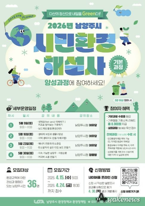 어웨이크뉴스 오경하 기자 | 남양주시는 오는 24일까지 시민이 직접 기후위기와 생태환경을 배우고 이를 지역사회와 나누는 ‘2026년 남양주시 시민환경해설사 기본과정’ 참여자를 모집한다고 15일 밝혔다.