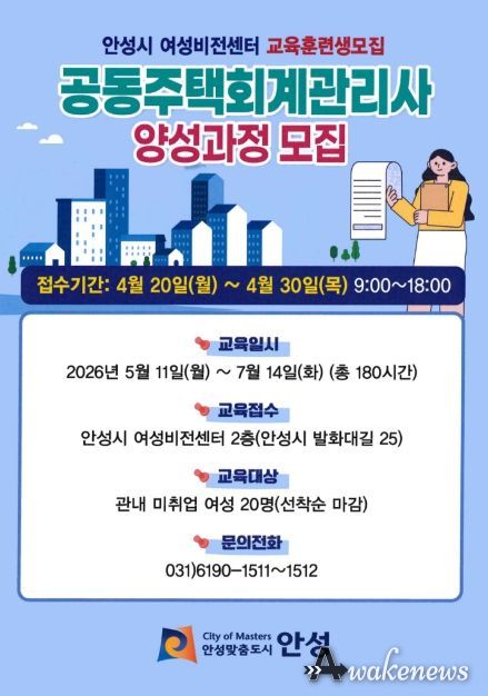 어웨이크뉴스 오경하 기자 | 안성시 여성비전센터는 경력보유여성의 성공적인 재취업을 지원하기 위해 오는 4월 30일까지 ‘공동주택 회계 관리사 양성과정’에 참여할 직업 훈련생 20명을 모집한다고 밝혔다.