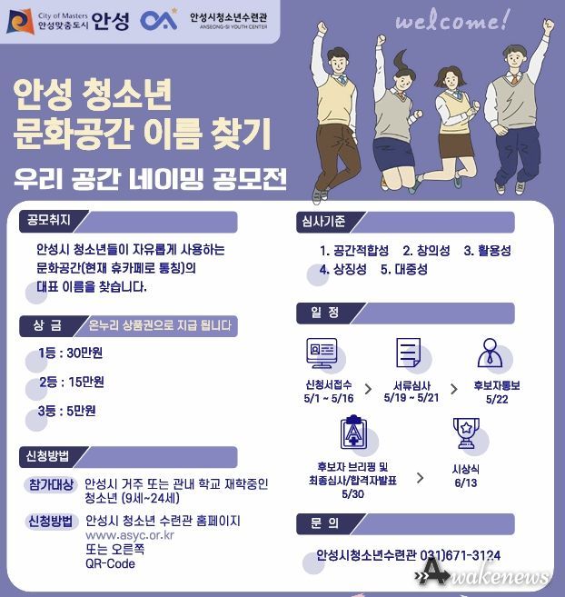어웨이크뉴스 오경하 기자 | 안성시청소년수련관이 관내 청소년 자유공간인 ‘청소년 휴카페’의 통합 브랜드 구축을 위해 '청소년 휴카페 네이밍 공모전'을 개최한다.