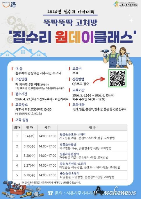 어웨이크뉴스 오경하 기자 | 시흥시주거복지센터는 오는 5월부터 시민들의 자가 주거관리 역량 강화를 위해 2026년 집수리 아카데미 ‘뚝딱뚝딱 고쳐방’ 원데이 클래스를 진행하는 가운데 참가 교육생을 모집한다.