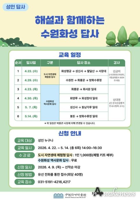 어웨이크뉴스 오경하 기자 | 수원화성박물관이 성인을 대상으로 하는 ‘해설과 함께하는 수원화성 답사’ 프로그램을 5월까지 운영한다.