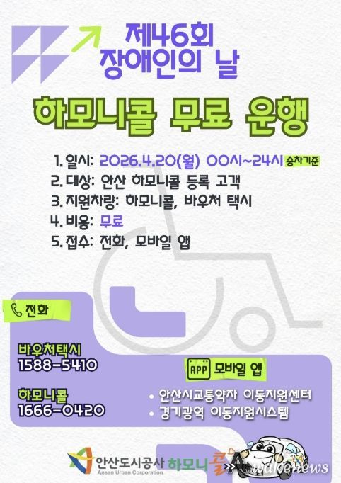 어웨이크뉴스 오경하 기자 | 안산도시공사는 오는 4월 20일 ‘제46회 장애인의 날’을 맞아 교통약자를 위한 특별교통수단인 하모니콜과 바우처택시를 하루 동안 무료 운행한다고 16일 밝혔다.