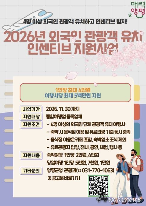 어웨이크뉴스 오경하 기자 | 양평군은 외국인 관광객 유치를 촉진하고 침체된 지역 관광산업에 활력을 불어넣기 위해 ‘2026년 양평군 외국인 관광객 유치 인센티브 지원사업’을 추진한다고 밝혔다.